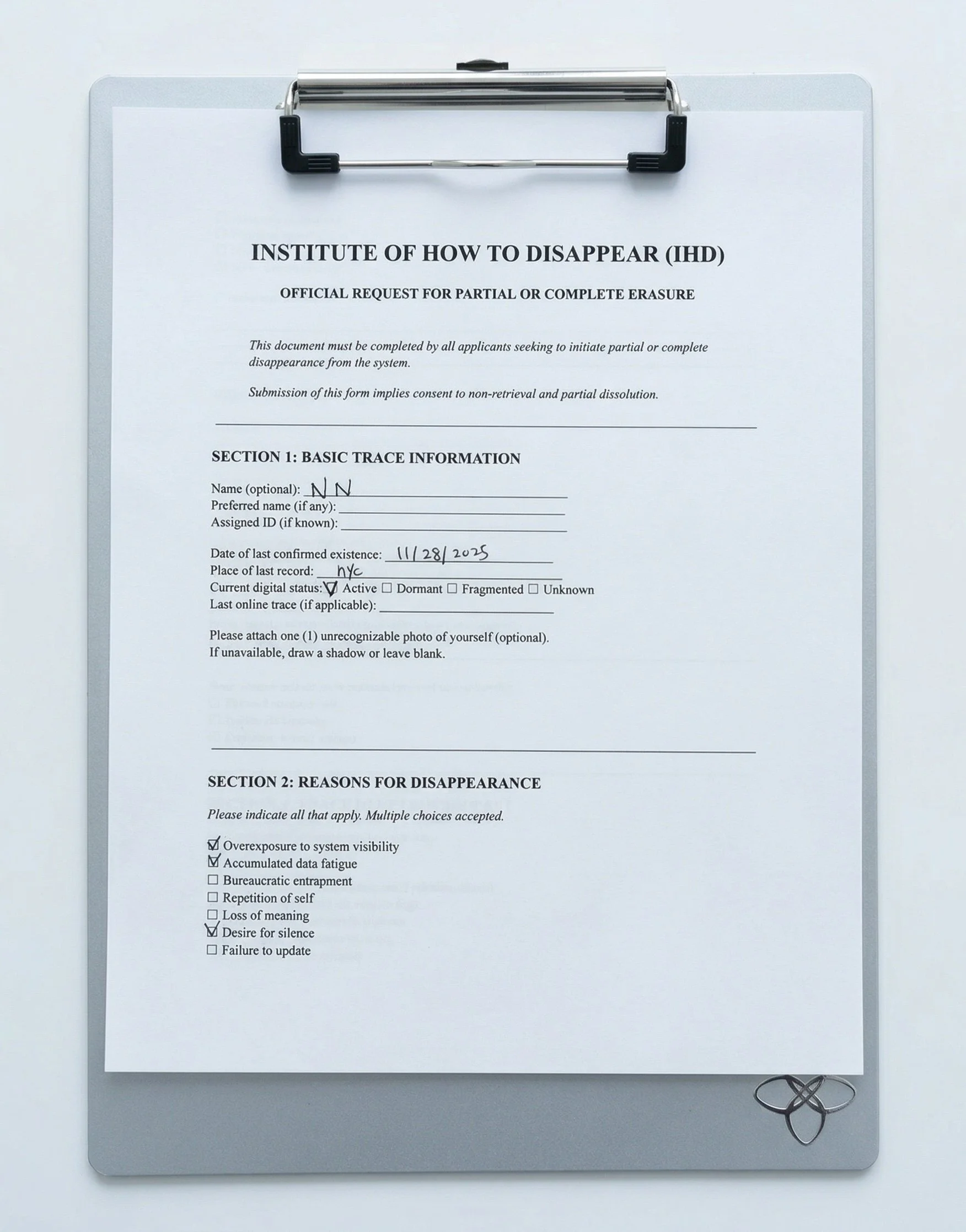 UPCOMING: INSTITUTE OF HOW TO DISAPPEAR | Temporary Intake Facility – New YorkOperational Week 01