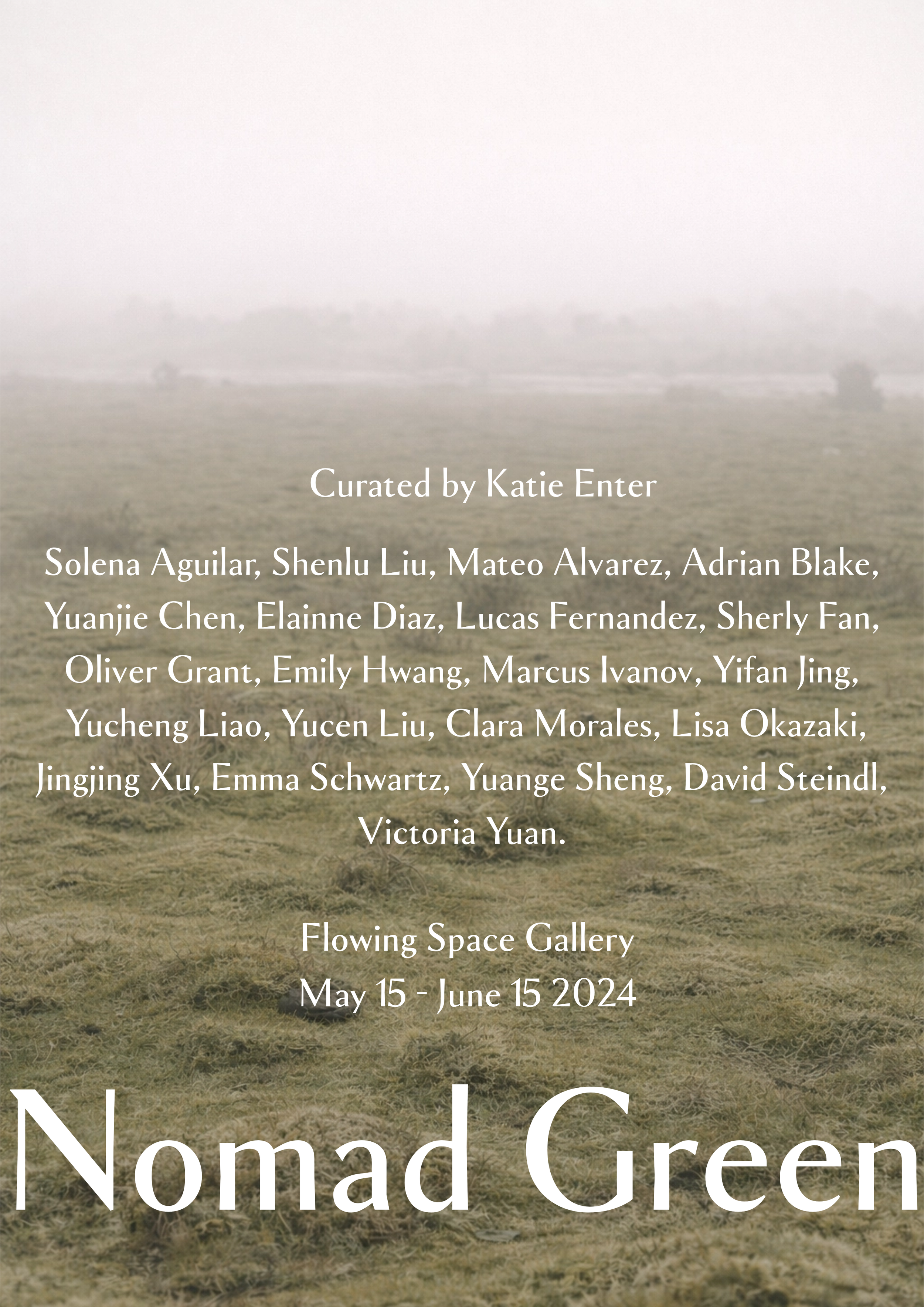 Flowing Space Galleryis pleased to announce the group exhibition Nomad Green, curated by Katie Enter. The exhibition will be held at Flowing Space Gallery, located at 16 Clinton Street, New York, NY, and will run from April 15 - May 15, 2024. Featuring works by twenty-one artists—Solena Aguilar, Mateo Alvarez, Adrian Blake, Yuanjie Chen, Elainne Diaz, Lucas Fernandez, Sherly Fan, Oliver Grant, Emily Hwang, Marcus Ivanov, Yifan Jing, Jingjing Xu, Yucheng Liao, Shenlu Liu, Yucen Liu, Clara Morales, Lisa Okazaki, Emma Schwartz, Yuange Sheng, David Steindl, Victoria Yuan.