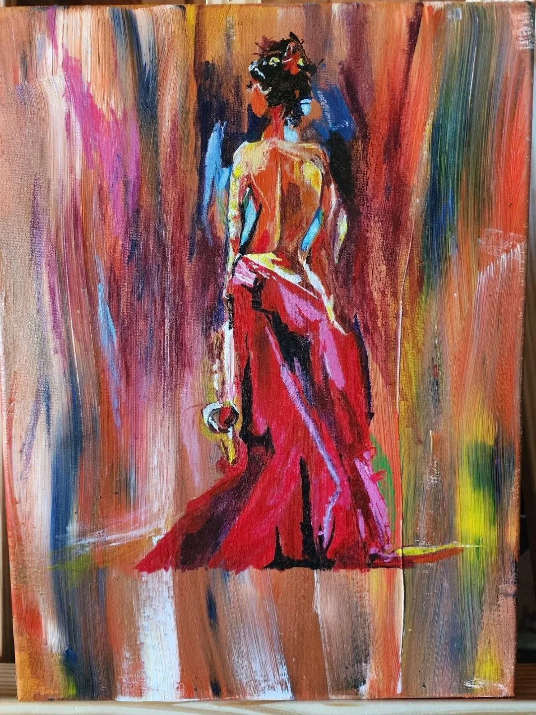H: The Fluidity in my abstract art has often played a huge role in shaping the atmosphere in my work, yes. In my "Savannah Nights" painting, for example, I found that adding more water beneath the couple's feet enhanced the fluidity, rather than painting them just dancing. I had an idea and suddenly added something to the painting, and found it worked better in the flow and emotion. This is common with artists. Nothing is wrong with a new direction in art. It is a beautiful rule. The idea is to enhance the atmosphere by increasing the movement. I am currently working on a painting that has faster-paced movements.
